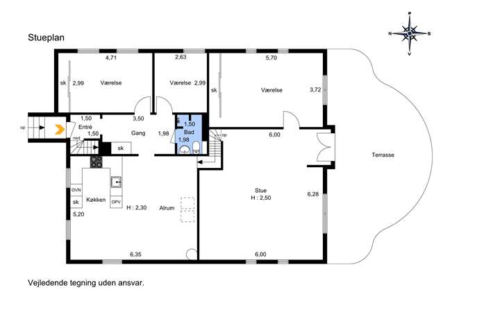· Indgangsetagen byder på entré, to gode værelser og et badeværelse. Videre fremme åbner det store køkken/alrum sig op med ovenlysvinduer, der giver et flot lysindfald.
