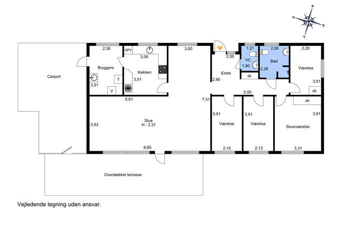 Indeh.: Forstue med gæstetoilet. Hyggelig vestvendt stue med panoramaudsigt over haven og skoven og med udgang til terrasseoverdækning.