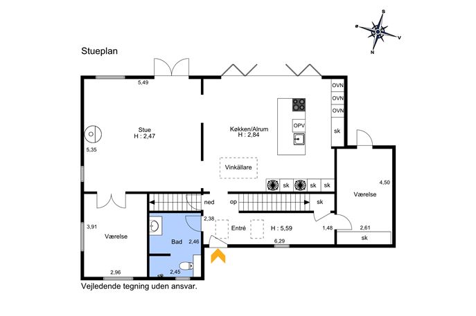 Ankomst i hall med næsten 6 meter til loftet og flot trappeløb til 1. salen. Videre ind i det lækre køkken/alrum med kæmpe foldedør ud til haven. Om sommeren nydes direkte åben forbindelse mellem køkken og terrasse. Tjekket detalje med elektrisk glas ned til vinkælder. Køkkenet er dansk design og kvalitet fra Svane med bl.a. Quooker (med både kogende vand og køligt danskvand) og Bore X Pure kogeplade med indbygget emhætte, Åben forbindelse til opholdsstuen med brændovn (hybrid brændeovn med mulighed for både at bruge brænde og træpiller, - kan styres med en app). Der er også app til at stye vaskemaskine, ovnene, lyset, vinkælderen, mv.
