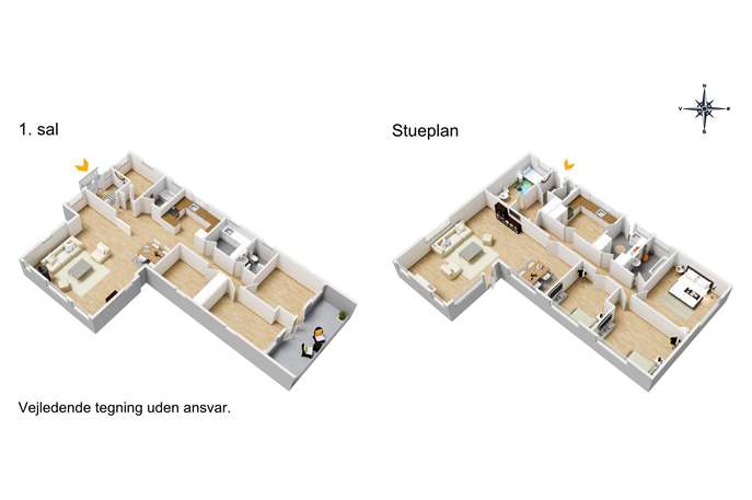 Stueplan rummer fire værelser, to badeværelser, køkken, bryggers og en stor opholdsstue med pejs som husets naturlige samlingspunkt. Herfra er der direkte adgang til terrassen og den frodige have, hvor solen kan nydes fra morgen til aften. Etagen fremstår i original stand og giver dermed en enestående mulighed for at sætte sit eget præg og skabe et hjem, der matcher netop dine ønsker og drømme.