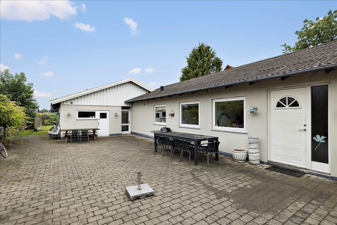 Villaen er flot pudset og har en overdækket terrasse, der forlænger sommerens udendørs glæder. Den dejlige, lukkede have er en oase af ro med en god blanding af hegn og randbeplantning, der sikrer privatliv. Et godt skur er indbygget i huset, hvilket giver ekstra opbevaringsplads.
