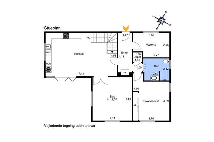 Huset er virkelig flot istandsat med bl.a. nyere varmepumpe og gulvvarme i hele stueetagen. I kommer ind i huset via entré med garderobeplads - her er også stort anvendeligt skab. Fint værelse. Stort soveværelse mod haven med skabsvæg. Pænt badeværelse med separat bruseniche. Super lækkert og meget stort køkken-alrum med flotte Invita-elementer, keramisk bordplade, hårde hvidevarer af meget høj kvalitet og Quooker med Cube (danskvand). Køkkenet har virkelig god skabsplads og der er plads til et meget stort bord i rummet. Fra køkken-alrum er der udgang til sydvestvendt overdækket terrassse som er yderst charmerende med vinranker og ferskentræ. Herfra er der trappe til den lukkede og ugenerede have som er plan i forhold til mange andre steder i Hareskovby. Endvidere er der i stueetagen rigtig hyggelig opholdsstue. I hjørnet af køkken-alrum er der meget stilfuldt lavet trappe til kælderen.