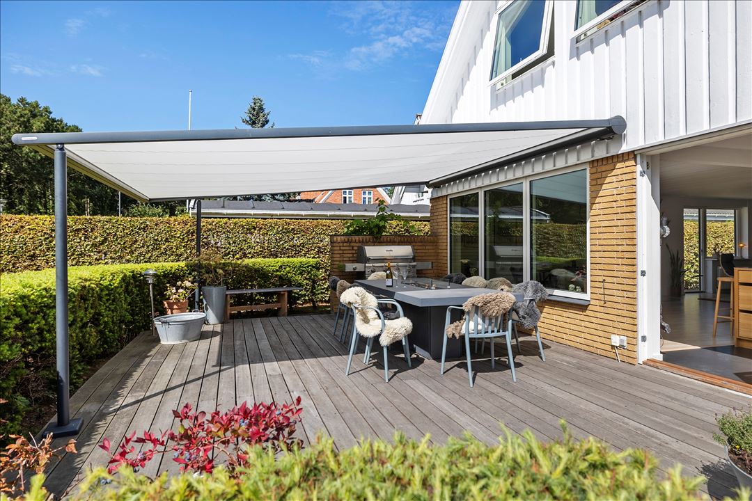 Udenfor venter en velpasset grund på 1.186 m². Anlagt med en flot indkørsel til garagebygningen, en dejlig forhave med græsplæne, bevoksning og nedgravet trampolin samt en solrig terrasse med udgang fra køkkenet, der indbyder til hyggelige stunder med familie og venner. Bag boligen findes et græsareal med plads til boldspil, legestativ, køkkenhave og bålplads – direkte ud til en blind vej med adgang til stisystemet i ”Løkkerne”.