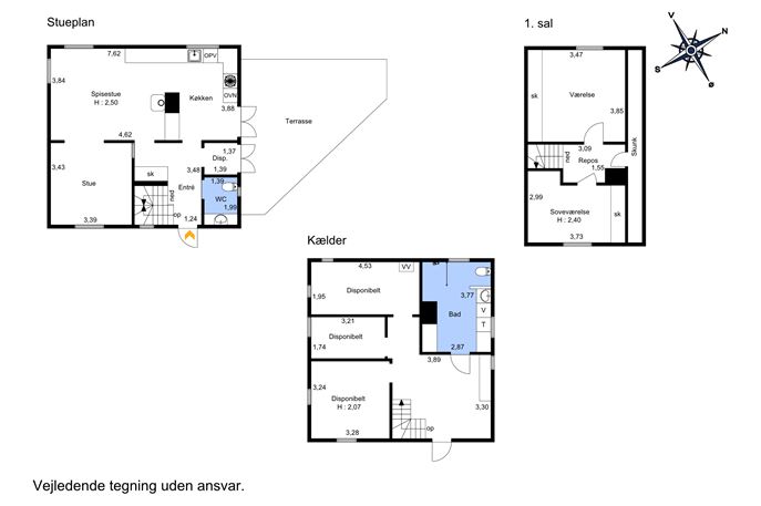 Entré / trapperum med god opbevaringsplads, som fungerer som hverdagsindgang. Her er også et stort og flot badeværelse med toilet, håndvask, bruseniche og installationer til vaskemaskine og tørretumbler. Derudover er der nogle disponible rum, som nuværende ejer anvender til værksted, fyrrum og "gæsteværelse".