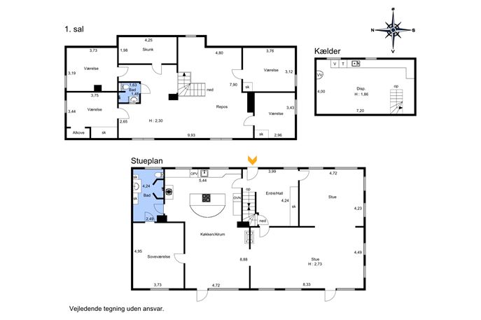 Stor, åben repos med gode anvendelsesmuligheder, fx som aktivitetsrum, krearum eller kontor - samt mulighed for at etablere et ekstra værelse. 4 værelser. Flot nyere badeværelse fra 2020 med terrazzo fliser, væghængt toilet, håndvask, bruseniche og gulvvarme. Depotrum/lagerrum.
