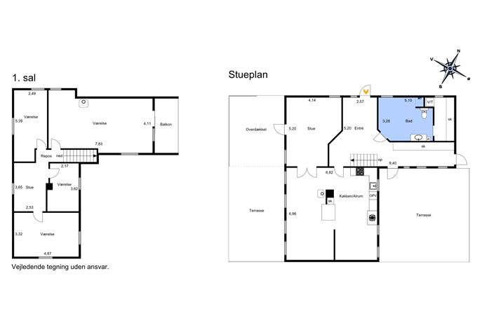 Repos. Stort soveværelse med brændeovn og udgang til altan. 3 gode værelser.