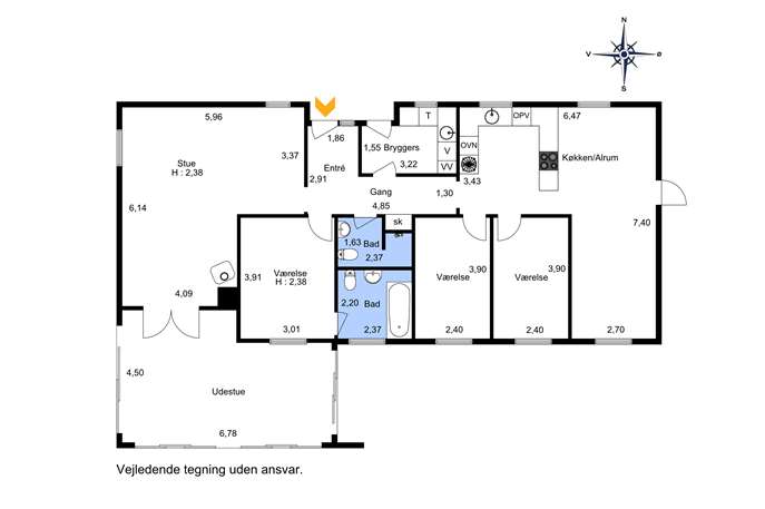 Når du træder indenfor, mødes du af en indbydende entré, et praktisk bryggers med både vaskemaskine og tørretumbler, samt et stort køkken-alrum. Alrummet er husets naturlige samlingspunkt, og her er ét værelse inddraget for at skabe ekstra spiseplads – en løsning der nemt kan ændres tilbage, hvis du ønsker et ekstra værelse. Køkkenet er desuden udstyret med en moderne luft-til-luft varmepumpe, som sikrer en behagelig temperatur året rundt.