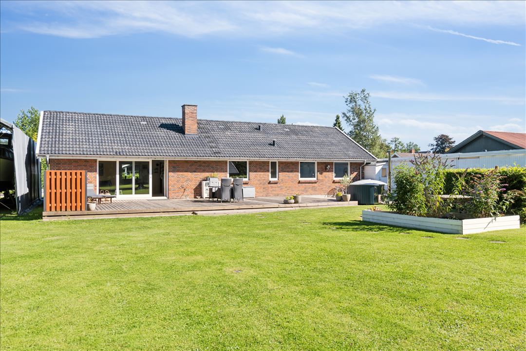 Fra stuen træder I ud på den store træterrasse, hvor dagens måltider kan nydes under åben himmel. Haven er som skabt til både leg og stille stunder - her venter alt fra solrige eftermiddage på plænen til hyggelige aftener ved bålet i shelteret.