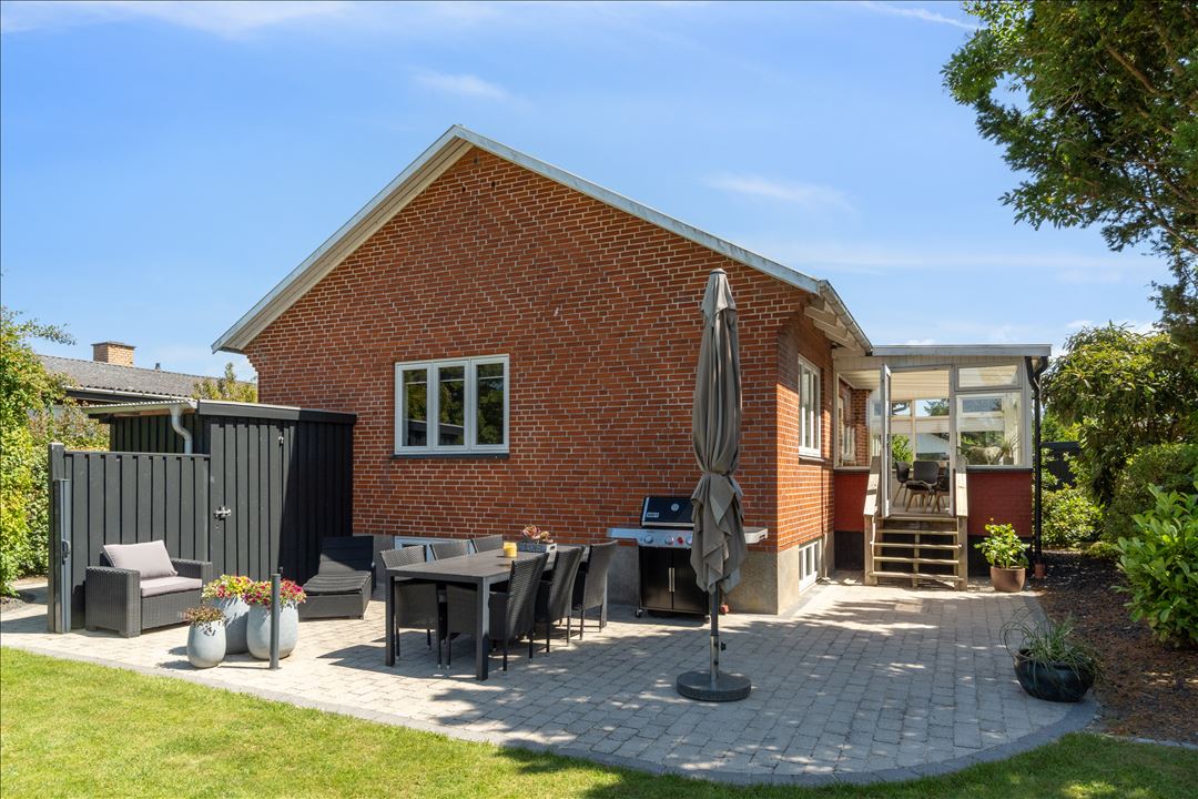 Ejendommen, opført i 1950, står smukt i rød facadesten med energiruder fra 2015 og det oprindelige eternitski fertag. Fra den åbne forhave, belagt med skærver, fører en elegant flisegang dig direkte til hoveddøren.