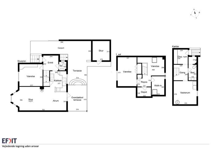 I stueplan findes desuden et værelse og et toilet, mens førstesalen rummer en anvendelig repos, et værelse og et walk-in-område, som giver ekstra opbevaringsmuligheder. Kælderen er funktionel og veldisponeret med et renoveret badeværelse, et vaskerum og et disponibelt rum, som eventuelt kan anvendes til hobby eller opbevaring. Bemærk, at loftshøjden i badeværelset er begrænset til 183 cm.