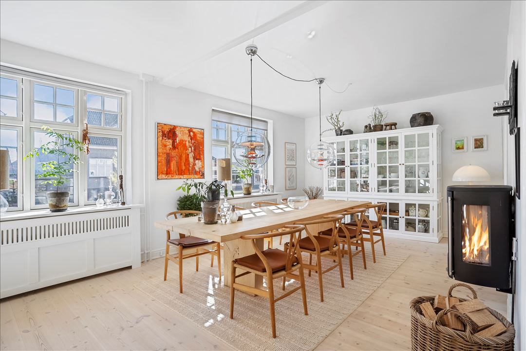 Indenfor bydes du velkommen i en lys entré, hvorfra du træder direkte ind i det flotte, hvide køkken. Køkkenet har masser af bord- og skabsplads og udstråler en indbydende atmosfære. Herfra er der åben forbindelse til den store og lyse spisestue, som har god plads til det lange spisebord og samvær med gæster. Videre finder du den hyggelige stue, der er i forlængelse af spisestuen, og som har direkte udgang til terrassen og haven – en oplagt løsning, når inde- og udelivet skal forenes. I stueplan finder du desuden et gæstetoilet, som giver ekstra komfort i hverdagen.