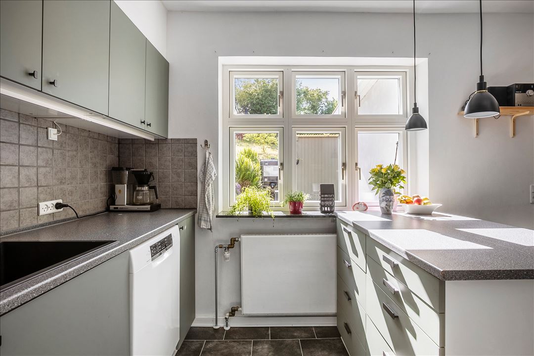 I dag fremstår huset med lyse, vandskurede facader under taget, der ligesom de traditionelle dannebrogsvinduer i tre fag vidner om et byggeri med masser af charme. Man har heller ikke været bange for at justere på den klassiske opskrift - blandt andet med en tilbygning i 2020. Her har man også placeret solpanelerne, som har en normeret effekt på 4 kW. Værd at bemærke er også, at fjernvarmen er lige på trapperne - bogstaveligt talt. Den er nemlig allerede indlagt og mangler bare at blive tilsluttet.