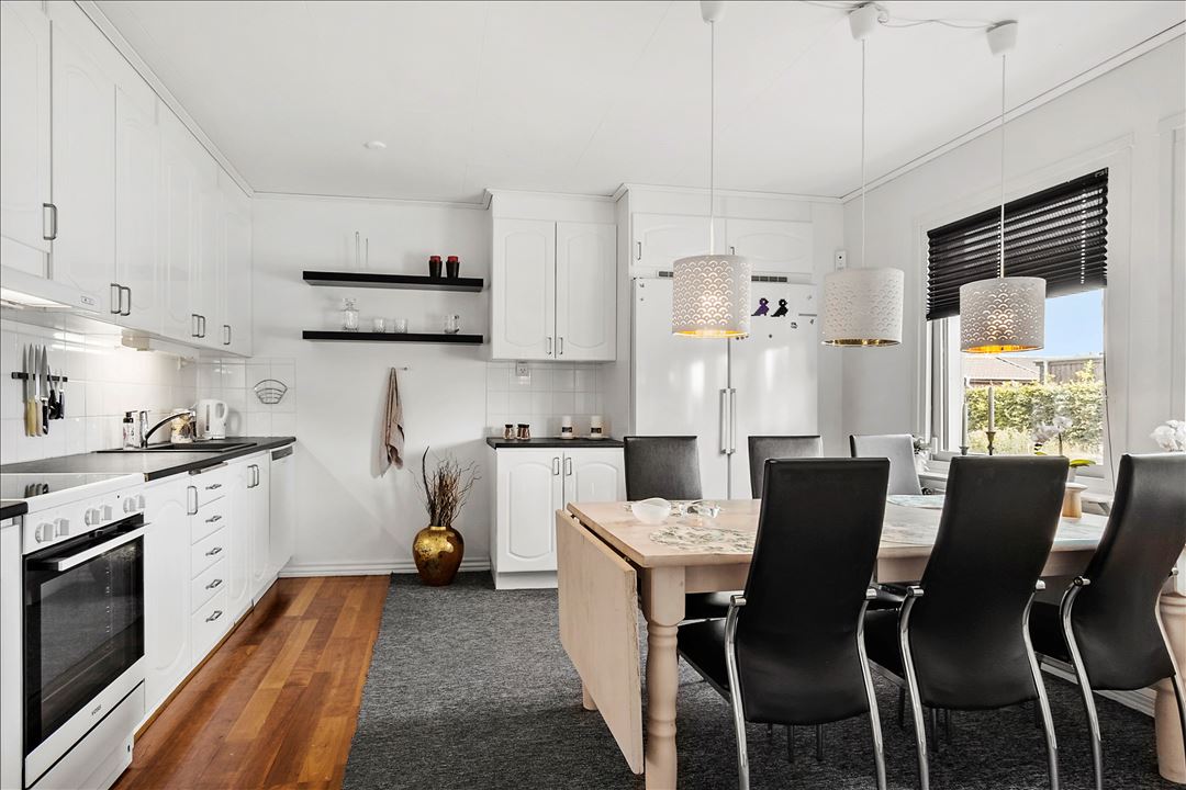 Inden døre spreder planløsningen de respektive afdelinger på tværs af etagerne. I stueplan får I to værelser, mens førstesalen byder på yderligere to, der mødes omkring en stor repos i stuestørrelse. Ovenpå har det ene værelse eget badeværelse, mens stueplan rummer både et flot baderum og et godt bryggers. Ydermere finder I de daglige opholdsrum, som består af et stort køkken og en hyggelig stue. Køkkenet er udført med pæne, hvide elementer, som toppes af en sort bordplade, og rummet har rigelig plads til et spisebord. Stuen kan til gengæld bryste sig af et flot, naturligt lysindfald, og herfra har I endvidere udgang til haven mod syd.