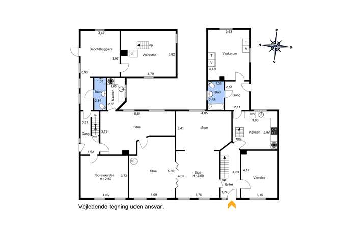 Boligen er på i alt 193 m2 bolig + i alt 79 m2 baghus. Boligen indeholder entre med trappe til 1 salen, 2 stuer slået sammen og adskilt til en tredje stue med pille-brændeovn, stort opholdsrum/værelse, soveværelse, værelse, pænt og lyst køkken med plads til spisebord, 2 badeværelser, 1 i hver ende af huset, det ene med kar og brus og det andet med brus, grovkøkken og gang med udgang og yderligere en trappe til 1 salen. 1 salen indeholder stort reposrum/kontorplads, 2 meget store værelser og en stue, der evt. kan opdeles i flere værelser.