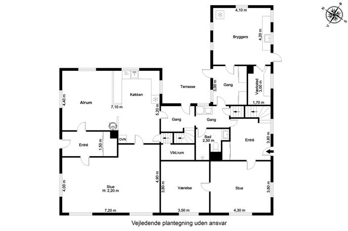 Indenfor finder du hele seks værelser, og der er endda mulighed for at etablere et syvende, hvis behovet opstår. Planløsningen giver god fleksibilitet, så hjemmet let kan tilpasses både børnefamilien, dem der arbejder hjemme, eller jer der ønsker et ekstra gæsteværelse.