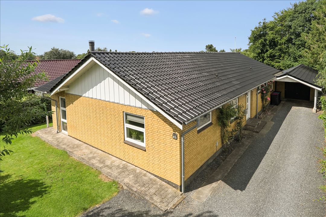 Grunden på 1.126 m² er let at holde med primært græsareal, og den omkransende hæk giver en lukket og privat have, perfekt til børneleg, afslapning og hyggelige sommeraftener.