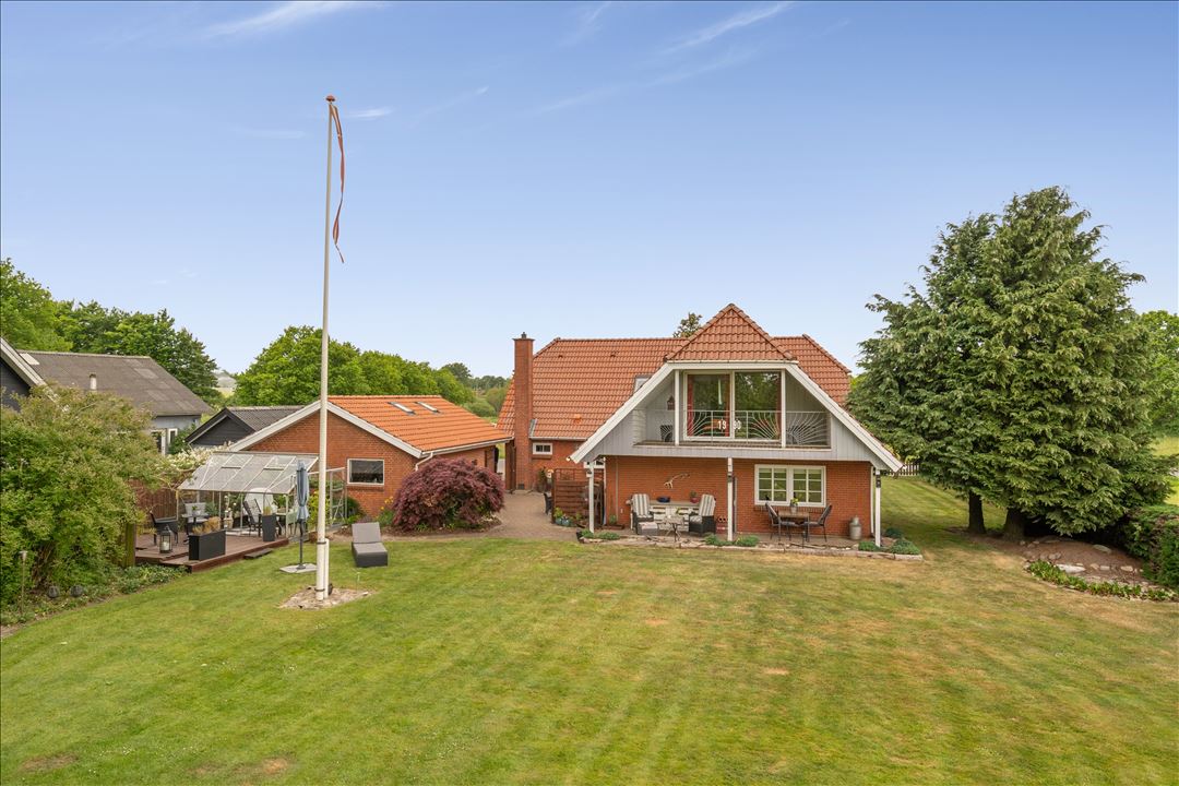 I den fredfyldte natur en lille kilometer øst for Næsbjerg finder du denne charmerende landvilla, der med sine 251 m2 bolig giver god plads til selv den pladskrævende familie. Boligen er indrettet med fem værelser og flere familievenlige opholdsrum, ligesom du kan se frem til en muret garage med værksted, flere private terrasseområder og stor, sydvendt have på i alt 1.956 m2.Næsbjerg er en hyggelig, lille by ti minutters kørsel fra Varde. Byen har egen skole, daginstitutioner, indkøb i Dagli'Brugsen samt et aktivt kultur- og foreningsliv. Selve ejendommen er en del af en lille bebyggelse med få huse omkring sig, mens haven grænser direkte op til de åbne landskaber, som du i øvrigt kan betragte fra såvel hus som have.