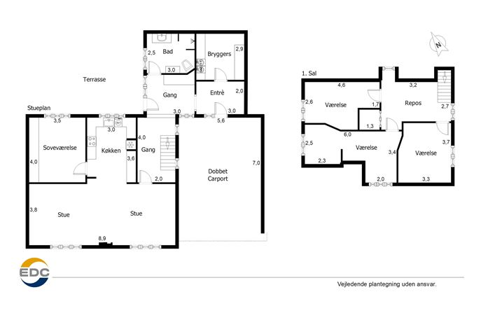 Førstesalen rummer de øvrige værelser, som samles omkring en lys repos. Her er plads til børneværelser, hjemmekontor eller gæsterum, og reposen giver oplagte muligheder for et legehjørne eller et stille læsehjørne med kig gennem det store skråvindue.