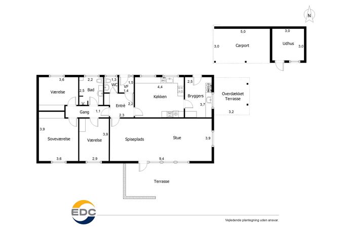 Ejendommen fuldendes af en carport med tilhørende et udhus, så cykler, plæneklipper og havemøbler kan stilles af vejen, når de ikke er i brug.