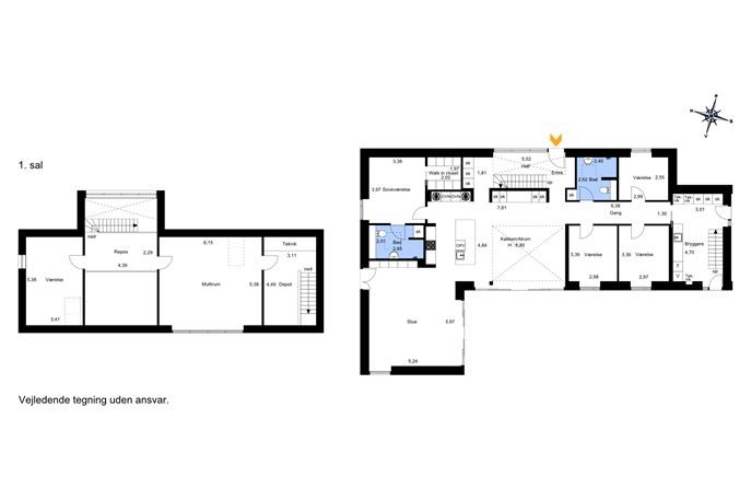 Indretning: Hall med garderobeplads og skulpturel svævende trappe til boligens 1. sal. Adgang til husets spændende leve rum, hvor rummeligheden giver plads til begejstring og plads til mange hyggelige stunder både med venner og familie. Her er åbent op til kip, og du får et køkkenalrum, hvor lyset strømmer ind fra de flotte vinduespartier og det store skydedørsparti mod haven. Her kan dørene åbnes helt op, så du nærmest trækker udemiljøet med ind i huset. Køkkenet er bygget op omkring den store køkken-ø og funktionalitet er i højsædet med arbejdsplads til mange personer. Gangen fører til væ­rel­ses­af­de­lin­gen samt bryggerset. Her er tre gode værelser, flot badeværelse med bruseniche og gode detaljer. Det store bryggers giver plads til hele familien med bl.a. vaskemaskine, tørretumbler, bordplads, opbevarings- og teknikskabe. Fra bryggerset er der også adgang til 1. salen. I modsatte ende af huset har du stuen med stort skydedørsparti mod haven. For­æl­dre­af­de­ling med rummeligt soveværelse, badeværelse samt praktisk walk in closet indrettet med både skuf­fe­sek­tio­ner og skabe. 1. salen rummer repos med kig til køkkenalrummet og view ud mod omgivelserne. Soveværelse mod nord samt stort aktivitetsrum, hvor der er plads til leg, ar­bejds­sta­tio­ner eller noget helt andet. Ved opgangen fra bryggerset er der repos med god plads til opbevaring eller indretning af hjemmekontor etc. Blandt de velvalgte løsninger er bl.a. lyddæmpede lofter, brede trægulvplanker, gulvvarme samt styring af indbyggede LED spots. Filtinddækning i køkkenalrum er forberedt til liste-påsætning.