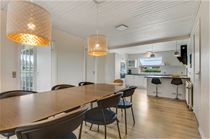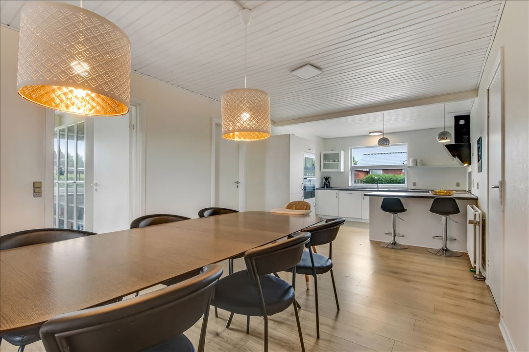 Køkken/alrum er med lyse elementer og stor spiseplads. Her er desuden direkte udgang til den delvis overdækkede, sydvendte træterrasse, hvor sommeren kan nydes i fulde drag.