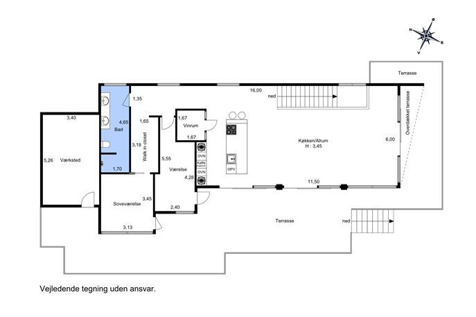 Nederste plan: To store værelser med egne walk-ins og direkte udgang til terrasse og have – perfekt til børn, gæster eller hjemmearbejde. Der er forberedt til et 5 værelse, såfremt det måtte ønskes.