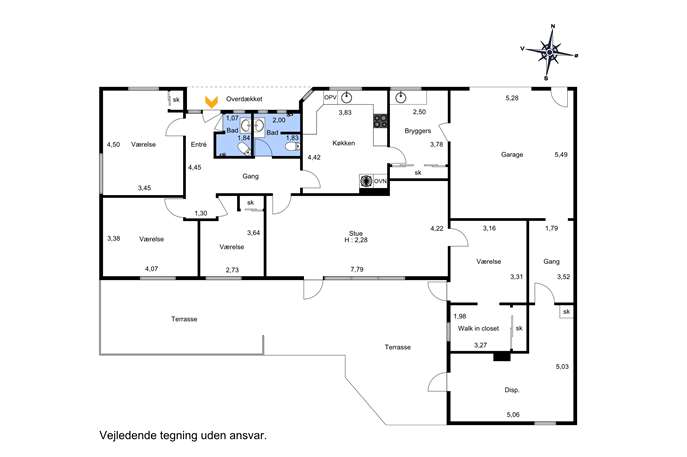 Indenfor bydes du velkommen i et stort og funktionelt bryggers med god skabsplads. Køkkenet har plads til spisebord og danner en naturlig ramme om familiens hverdag. Boligen rummer desuden et badeværelse med el-gulvvarme samt et gæ­ste­ba­de­væ­rel­se med brus. Der er to lyse og rummelige værelser, et kontor med udsigt til markerne, et for­æl­dresove­væ­rel­se samt en indbydende stue med udgang til terrassen – perfekt til både afslapning og hyggelige stunder med familie og venner.