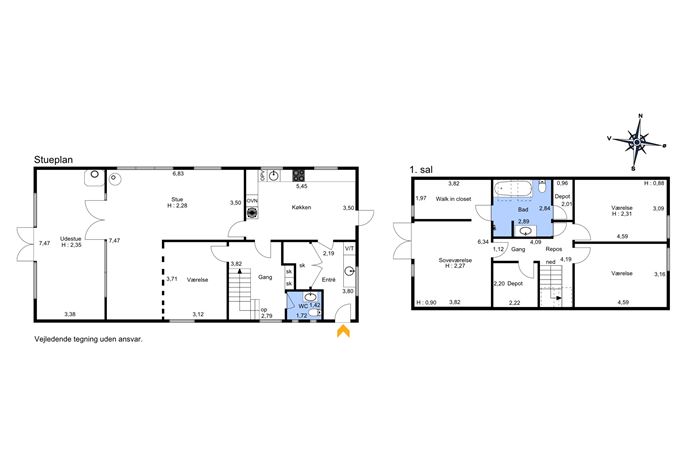 I stueplan findes desuden et stort værelse, der er opdelt med en let væg, så rummet nemt kan udvides til en endnu større stue, hvis man ønsker det. Det moderne gæstetoilet blev renoveret i 2012. En mellemgang med trappe fører til 1. salen, hvor man mødes af et stort badeværelse med både bruseniche og spabad/badekar samt adgang til et depotrum. Heroppe er der desuden tre rummelige værelser, hvoraf det ene har walk-in closet og direkte adgang til badeværelset – perfekt som forældreafdeling.