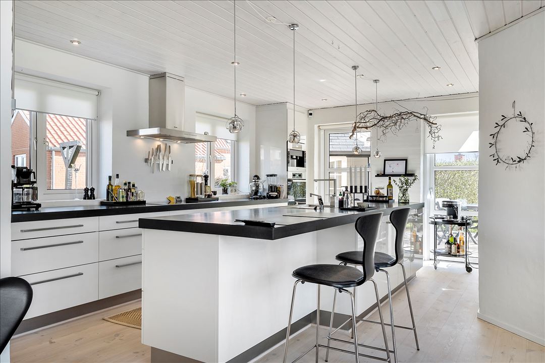 I stueplan møder du et imponerende køkken-alrum med smukke plankegulve, som skaber en varm og indbydende stemning. Det moderne køkken er indrettet med højglans HTH-inventar og har en stor kogeø, der fungerer som familiens naturlige samlingspunkt. Fra alrummet er der direkte adgang til en sydvendt terrasse, hvor solen kan nydes dagen lang, samt en velanlagt og ugeneret have. Mod øst finder du endnu en terrasse med en charmerende havepavillon – perfekt til rolige stunder.