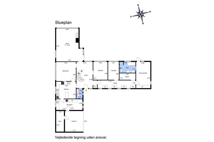 Huset rummer desuden et gæstebadeværelse, en rummelig fordelingsgang med trægulv og otte indbyggede skabe, to gode værelser, et depotrum samt et soveværelse med skabsvæg, eget badeværelse og udgang til terrassen. På førstesalen venter et stort gennemgangsværelse, som oplagt kan anvendes som stue eller kreativt værksted, samt endnu et værelse.