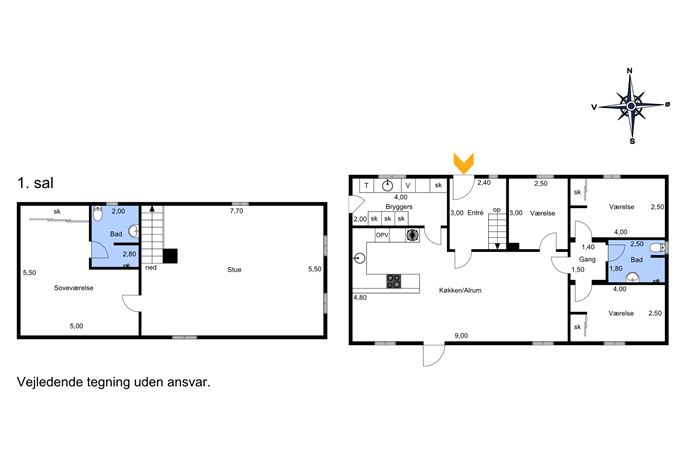 Stueetagen rummer desuden tre regulære værelser, som kan indrettes fleksibelt til soveværelser, børneværelser, kontor eller hobbyrum. Hertil kommer et badeværelse, en rummelig entré samt et praktisk bryggers med plads til hverdagens funktioner.