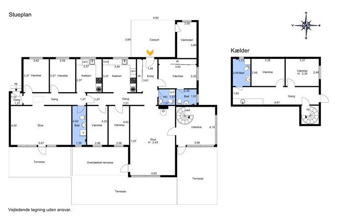 Indretningen byder på hele 5 værelser, 2 køkkener, 2 badeværelser samt et ekstra gæstetoilet. Dertil kommer 2 hyggelige stuer, et praktisk bryggers og en skøn udestue med nedgang til kælderen. Kælderen rummer yderligere 2 disponible rum, der nemt kan indrettes som værelser, hobbyrum eller kontor – samt endnu et badeværelse.
