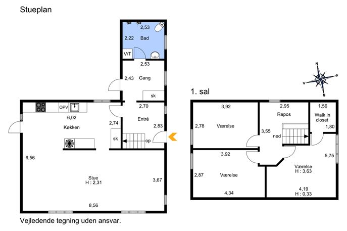 1. sal: Villaen byder på en god indretning af 1. sal med bred, anvendelig repos med ovenlysvindue og 3 rigtig fine og rummelige værelser med synlige bjælker. Heraf ét værelse med walk in closet samt to værelser med hems.
