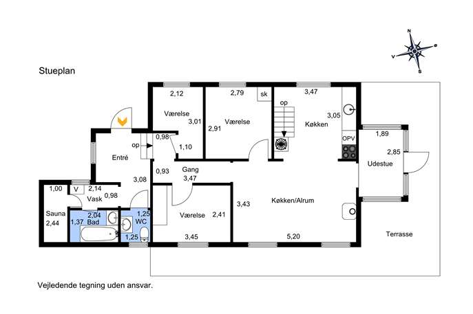 Resten af stueplan rummer tre gode værelser samt et badeværelse i forbindelse med både sauna og vaskerum. Det giver en fleksibel indretning, uanset om huset skal fungere som helårsbolig eller bruges som sommerhus.
