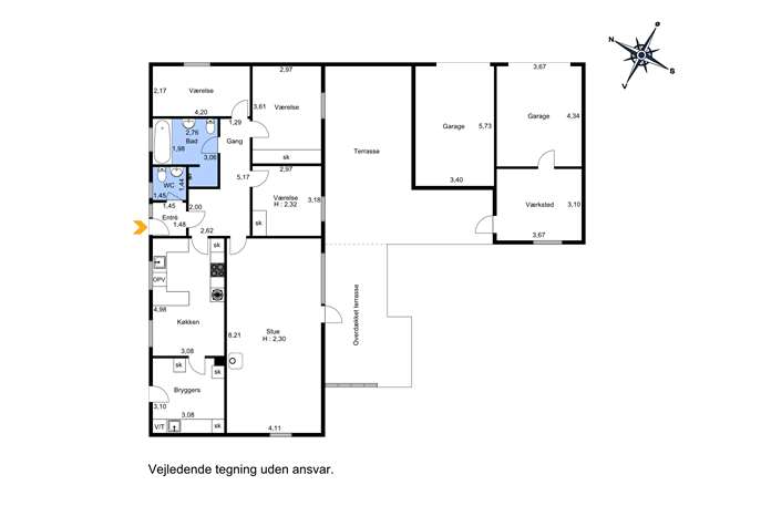 – Rummeligt bryggers med hvidt inventar, vask og plads til vaskemaskine og tørretumbler.