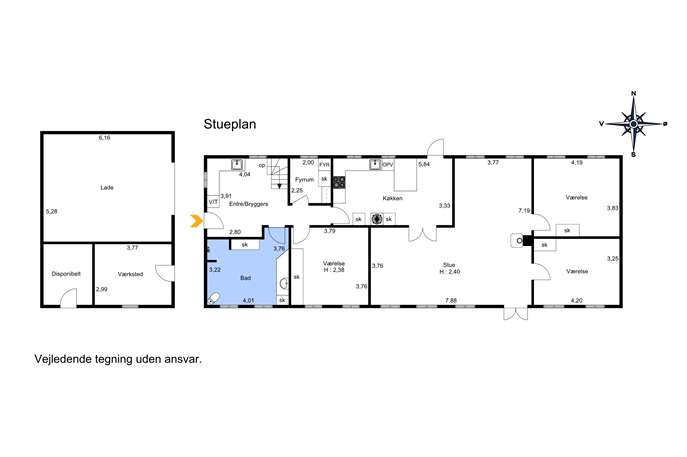 Derudover er der i stueplan et stort funktionelt badeværelse samt et praktisk bryggers/entré, hvor hverdagen nemt kan organiseres med overtøj, vaskefaciliteter og opbevaring.