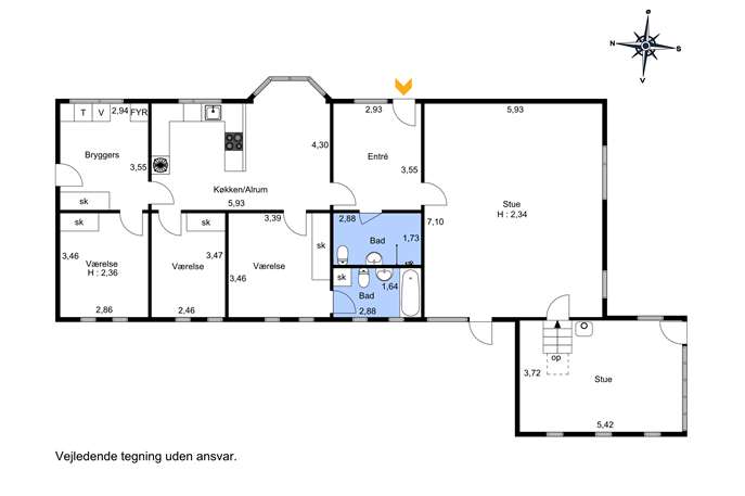 Boligen er i god stand med en indretning, der vil passe til de fleste. Her er en rummelig baggang, hvor der er god plads til vaskefaciliteter, overtøj, sports- og skoletasker. Herfra bliver du inviteret indenfor i et lyst og indbydende spisekøkken, hvor der er god skabs- og bordplads, og hvor der vil kunne laves skøn mad, mens børnene enten hjælper til, eller sidder og hygger sig med en malebog eller måske lektierne. Her er også en forgang, så dine gæster kan lukkes ind ad den vej, uden først at bekymre dig om, hvorvidt vasketøjet i bryggerset nu er lagt sammen og væk. Her er ligeledes en skøn, stor stue med trappe ned til endnu en dejlig stue, hvor man rigtig kan hygge sig omkring brændeovnen på de kolde dage. Fra begge stuer kan du træde ud på en af de to terrassen, hvor du kan finde læ og sol, og hvorfra du kan nyde et koldt glas eller lidt godt fra grillen, mens du betragter børnene, der løber og leger i den indhegnede - aflukkede haven. Huset tilbyder også 3 værelser, hvoraf forældresoveværelset har egen adgang til et af husets 2 badeværelser.