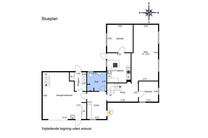 Indretning: Uanset om I parkerer bilen udenfor i den fine gårdsplads eller om I parkerer inde i garagen, så er der adgang ind til huset. Fra garagen er der adgang til et fint bryggers med skabe, luft/vand varmepumpe, plads til vaskefaciliteter samt udgang til haven. Garage giver adgang til en flot og indbydende entré med hvidt skuffearrangement. Herfra er åben forbindelse til gang med trappe til 1. sal samt et flot og rummeligt badeværelse med bruseniche. Gangen fører videre til et godt, regulært værelse samt den store stue. En skøn stue med godt lysindfald, der kan indrettes på flere måder. Et utroligt lækkert og lyst køkken med hvidt inventar og barfunktion. Herfra udgang til en super fin overdækket terrasse. Fra køkkenet er adgang til endnu et godt og regulært værelse. 1. salen er indrettet med repos/fordelingsgang, 3 fine, lyse værelser, walk in closet samt et disponibelt rum.