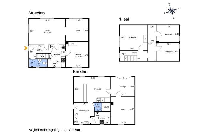 Indretning: Entré med trappe op- og nedgang. Badeværelse. Fint og funktionelt køkken, to stuer-en-suite samt et skønt soveværelse. Helt ideel stueplan og planløsning, der giver den lille familie, seniorerne eller enlige mulighed for at have alle leverum i ét og samme plan. 1. sal byder på repos og hele tre værelser. Kælderen indeholder et stort og praktisk bryggers med adgang til husets garage. Derudover disponibelt rum, fyrrum, baderum og sauna samt grovkøkken. Overalt i huset er der mange vinduer, så der er altid dejligt og lyst i hjemmet, uanset hvor du befinder dig. Flere steder fra boligen er der en skøn udsigt over åbne marker og vidder.