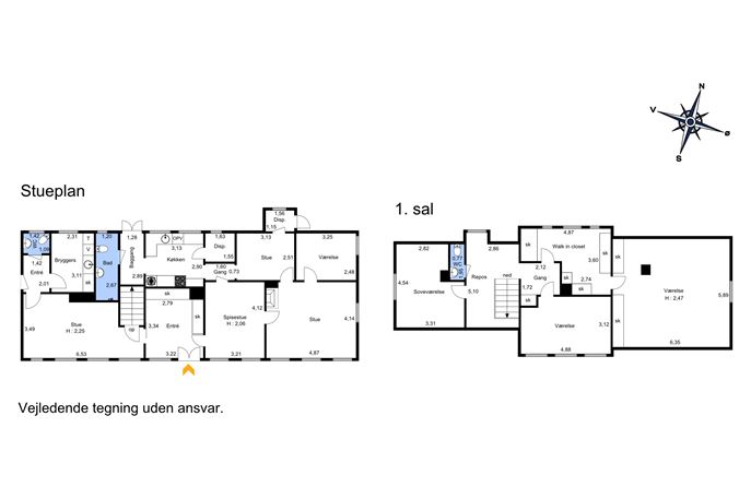 På førstesalen findes tre gode værelser, et toilet samt et walk-in-closet. Værelserne er rummelige, lyse og fulde af charme. Et hyggelig repos binder etagen sammen og skaber en funktionel og harmonisk indretning. Den charmerende stil og de originale detaljer er videreført på hele 1. sal.