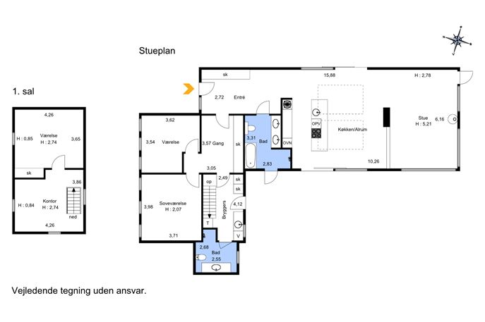 Væ­rel­ses­af­de­lin­gen har 2 værelser i den underste etage samt et kontor og et værelse på 1 sal. Der er desuden et badeværelse og et bryggers.