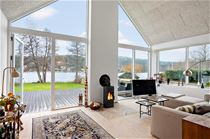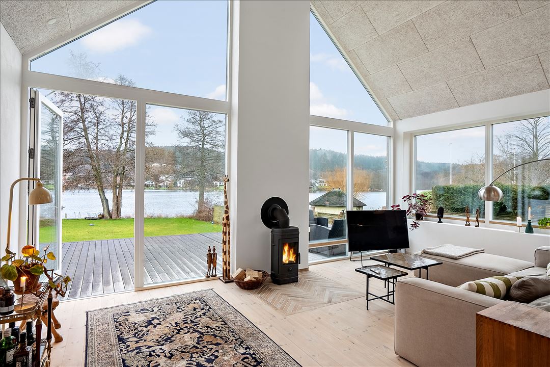 Køkken-alrummet er MEGA FEDT, har lofter til kip samt et fantastisk lysindfald fra 6 ovenlysvinduer og de store vinduespartier der kan skydes til side mod øst og vest terrasserne. Der er panoramaudsigt fra den lækre kogeø og der er ligeledes et fantastisk view ud over søen fra den hyggelige stue med brændeovn. Fra alrummet kan du gå ud på nyetablerede træterrasser mod øst, syd og vest. I forlængelse af alrummet er der et lækkert badeværelse med kar og brus samt direkte udgang til søen og en udvendig bruser.