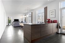 Boligens naturlige samlingspunkt er det store opholdsrum, hvor køkken-alrum og stue ligger i åben forbindelse. Det eksklusive køkken er indrettet med en køkkenø med flotte træfronter, god bordplads og barplads, mens de hvide, integrerede elementer giver et rent og tidløst udtryk. De store klinker og akustiklofter understreger den moderne arkitektur og giver en flot, ensartet helhed. De høje vinduespartier og flere udgange til terrasserne trækker lyset helt ind og binder inde- og udeliv naturligt sammen.