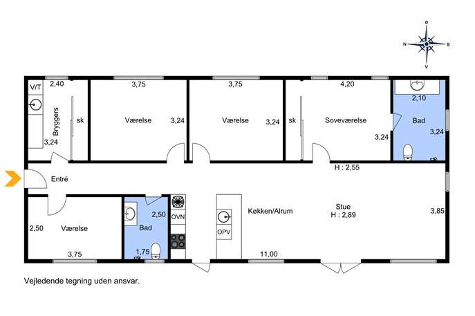 Planløsningen er gennemtænkt med en tydelig opdeling mellem opholdsafdeling og værelser. En lang, lys fordelingsgang med spots leder til flere gode værelser, der kan bruges som børneværelser, kontor eller hobbyrum, og samtidig får I en regulær soveværelsesafdeling med skabsvæg og direkte adgang til eget badeværelse. Derudover er der endnu et badeværelse, så hverdagen glider let, når familien skal ud ad døren, eller når der er gæster.