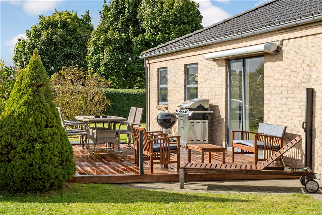Den 1.112 m² store grund byder på en nem og ugeneret have, der på den ene side grænser op til et grønt område. Her er plads til både boldspil, leg og afslapning. Udelivet kan nydes hele dagen på flere terrasser – blandt andet en sydvendt træterrasse med markise.