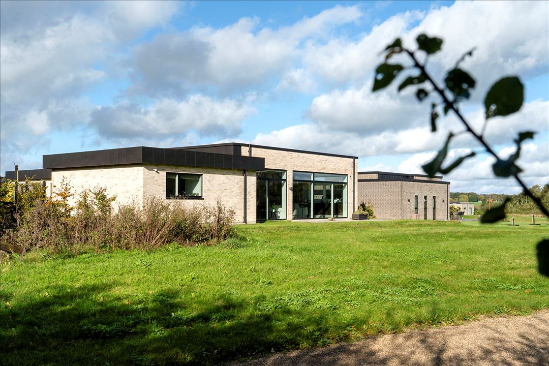 Dette helt igennem fantastiske hus, opført i 2022, er en modernistisk perle, som byder på 274 kvm. i topklasse, hvoraf de 200 kvm. udgør den smukt indrettede boligdel. Huset er opført af de lokale håndværkere Simon Skov og Jørgen Mejlvang, i Petersen Tegl og spækket med lækre detaljer, der gør boligen helt unik.