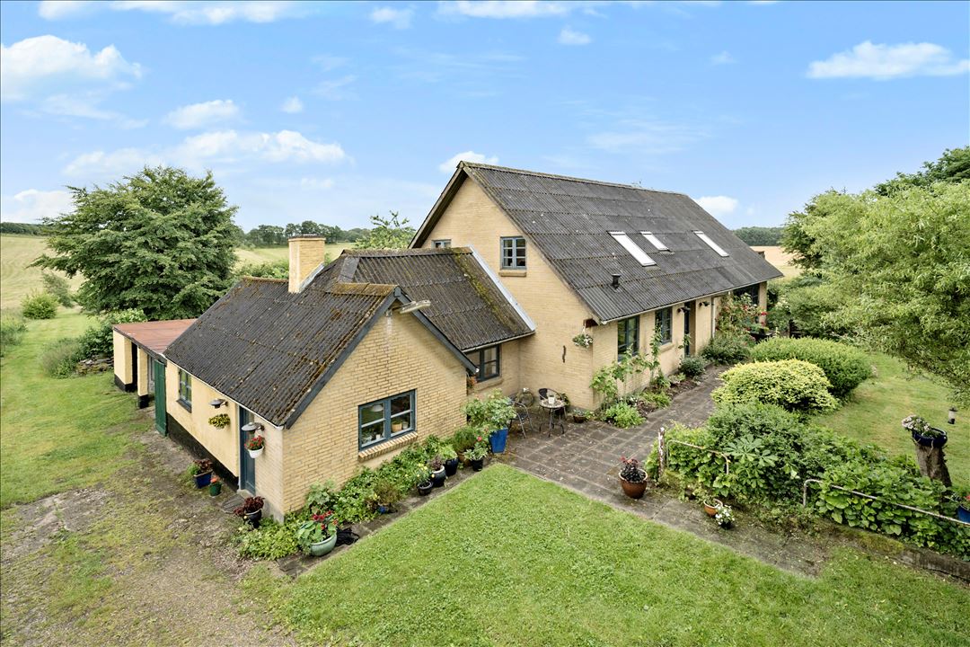 Huset, der oprindeligt er fra 70’erne, fremstår flot og løbende moderniseret. Med jordvarme som varmekilde har boligen energimærke B. På de 206 m² bolig fordelt på to plan, plus 51 m² høj og tør kælder, får du en fleksibel planløsning. Køkkenet ligger i åben forbindelse med stue og kan nemt udvides til stort køkken-alrum, mens førstesalen byder på hyggelig opholdsstue med synlige spær, trægulve, brændeovn og udgang til en sydvendt terrasse med udsigt over marker og natur.