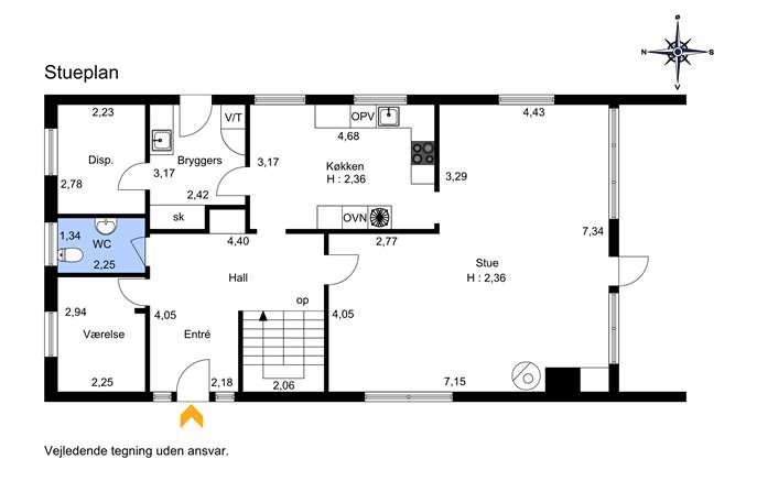 Villaen opvarmes med fjernvarme - supplerende varme via brændeovn.