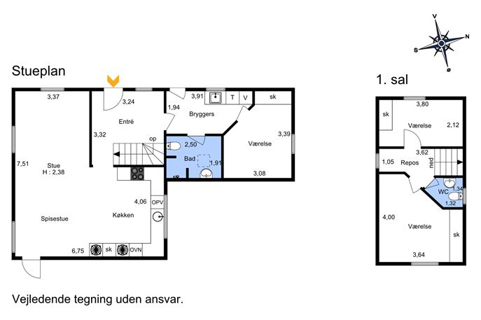 Stueetagen byder desuden på en lys og indbydende stue, et rummeligt soveværelse med indbyggede skabe samt et praktisk bryggers med plads til både vaskemaskine og tørretumbler. Entréen er både rummelig og funktionel med god plads til opbevaring og velkomst af gæster. Herfra fører en elegant trappe op til første sal, og under trappen findes et stort, lukket viktualierum med masser af op­be­va­rings­mu­lig­he­der.