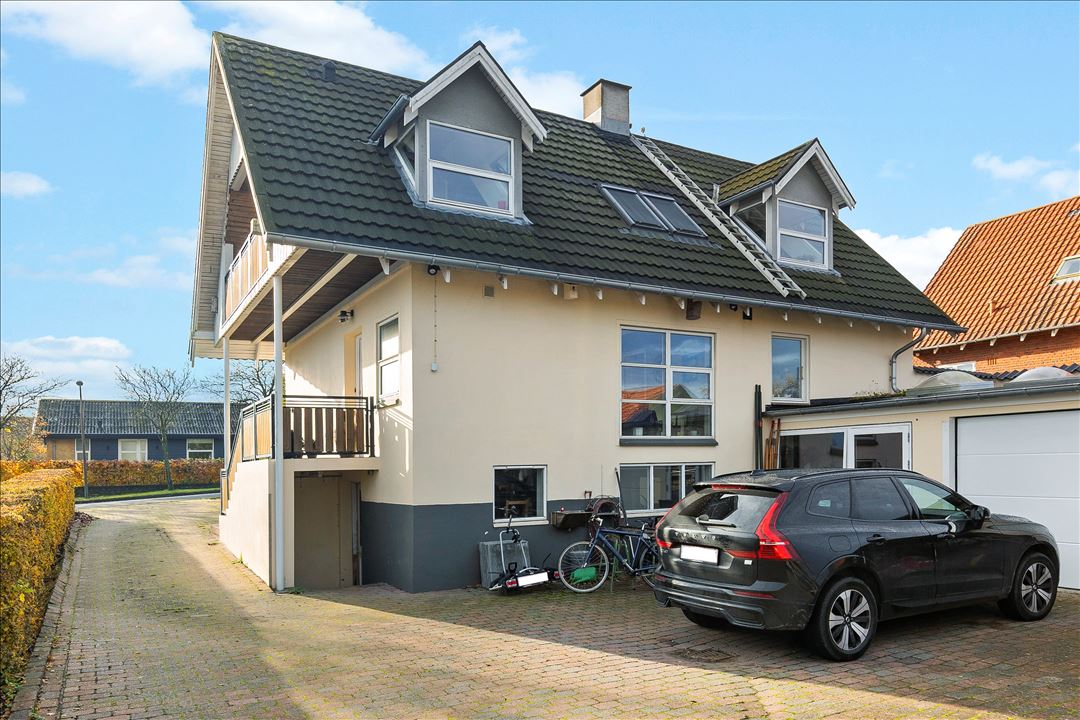 Udenfor venter en enkel, men fin have med god plads til både leg og afslapning. Til ejendommen hører desuden en rummelig garage på 42 m² samt en carport.